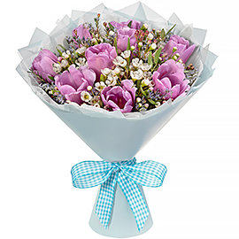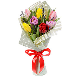 Тюльпан фиолетовый 3 шт., Тюльпан розовый 3 шт., Тюльпан красный 2 шт., Тюльпан желтый 3 шт., Лаванда 0.2 шт., Плёнка цветная, Лента