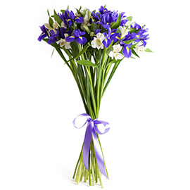 Ирис синий 15 шт., Альстромерия белая 6 шт., Лента