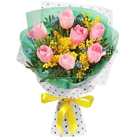 Мимоза желтая 0,25 шт., Тюльпан розовый 7 шт., Мускари 8 шт., Писташ, Плёнка цветная, Лента