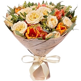 Тюльпан оранжевый 3 шт., Альстромерия оранжевая 1 шт., Солидаго 1 шт., Роза кустовая кремовая 1 шт., Писташ, Папоротник, Бумага упаковочная, Лента