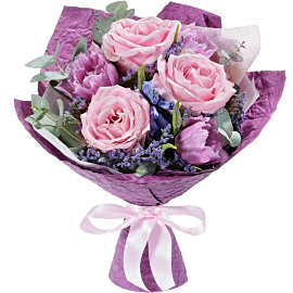 Лаванда 0,1 шт., Тюльпан фиолетовый 3 шт., Роза розовая 3 шт., Гиацинт синий 1 шт., Эвкалипт, Лента, Бумага жатая, Фетр, Статица фиолетовая