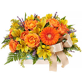 Роза кустовая оранжевая 2 шт., Альстромерия желтая 2 шт., Солидаго 1 шт., Коробка с принтом (Уменьшенная) 1 шт., Гербера-мини оранжевая 1 шт., Лаванда 0,1 шт., Папоротник, Оазис, Лента
