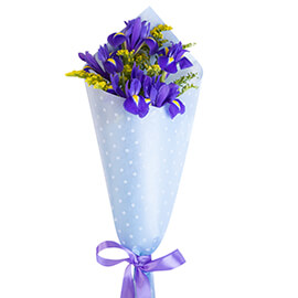 Ирис синий 5 шт., Солидаго 2 шт., Лента, Бумага упаковочная
