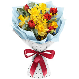 Мимоза желтая 0,25 шт., Нарцисс желтый 5 шт., Тюльпан красный 5 шт., Эвкалипт, Плёнка цветная, Лента