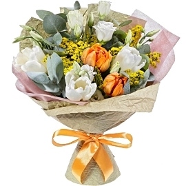 Тюльпан белый 3 шт., Тюльпан оранжевый 2 шт., Солидаго 1 шт., Лизиантус белый 1 шт., Эвкалипт, Лента, Бумага жатая, Фетр
